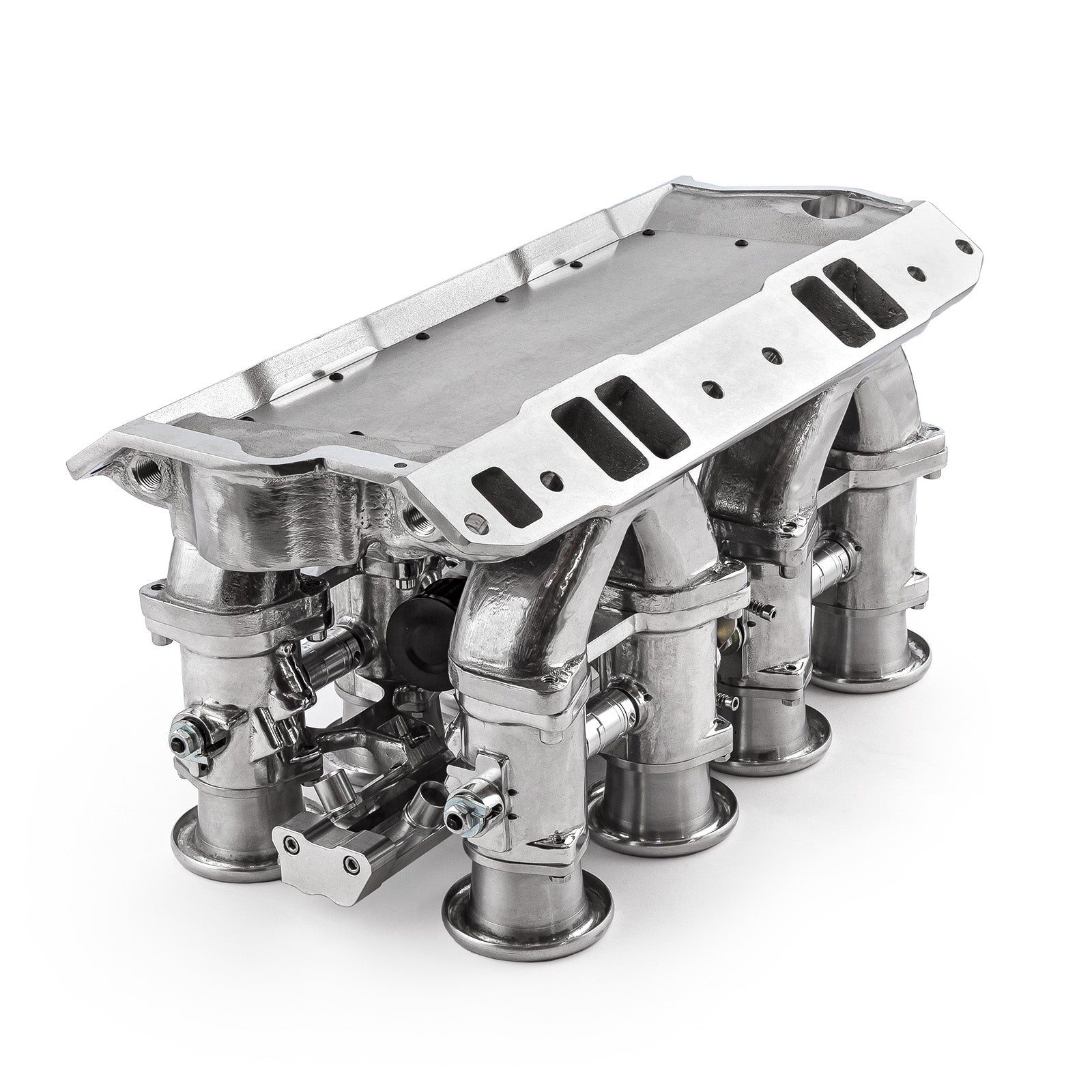 The Speedmaster Individual throttle body EFI system have all the flash of classic Weber induction but provide higher state of tune and engine performance versatility of EFI. Delivering crisp EFI performance with systems capable of supporting high hp. Fuel and air is delivered through precision cast aluminum 50mm IDA style throttle bodies that allow for superior idle characteristics and astounding throttle response while improving emissions and economy through tight air/fuel ratio control.