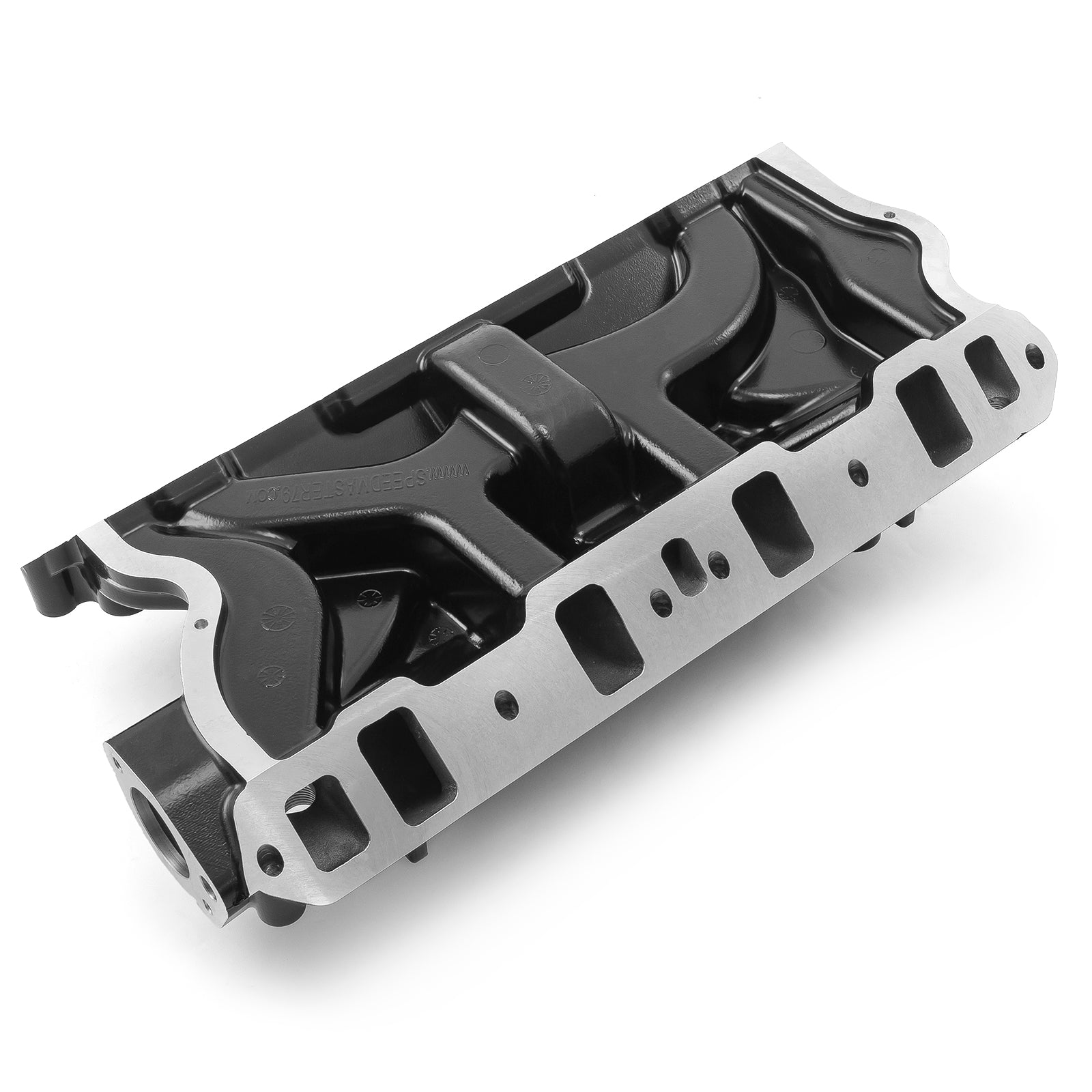 This Speedmaster LowRise manifold for 351w engines is the ultimate street performance manifold for this engine. It provides good top end power without sacrificing bottom end torque. Its long runner dual plane design provides the best of both worlds. Best with an aggressive street cam. For street, use a 600-750 cfm vacuum secondary or double pumper carb. For competition, use a 750-850 cfm double pumper. This manifold has a number of features not found in similar competitive manifolds. It includes a rear water crossover passage which can provide for more balanced cylinder head temperatures and a cooler running engine. It also has correctly positioned nitrous bosses for those of you who would like to add port nitrous injectors to your engine. Remember that every Speedmaster manifold is 100% pressure tested to discover any air, water, or exhaust leaks before you install it on your engine.