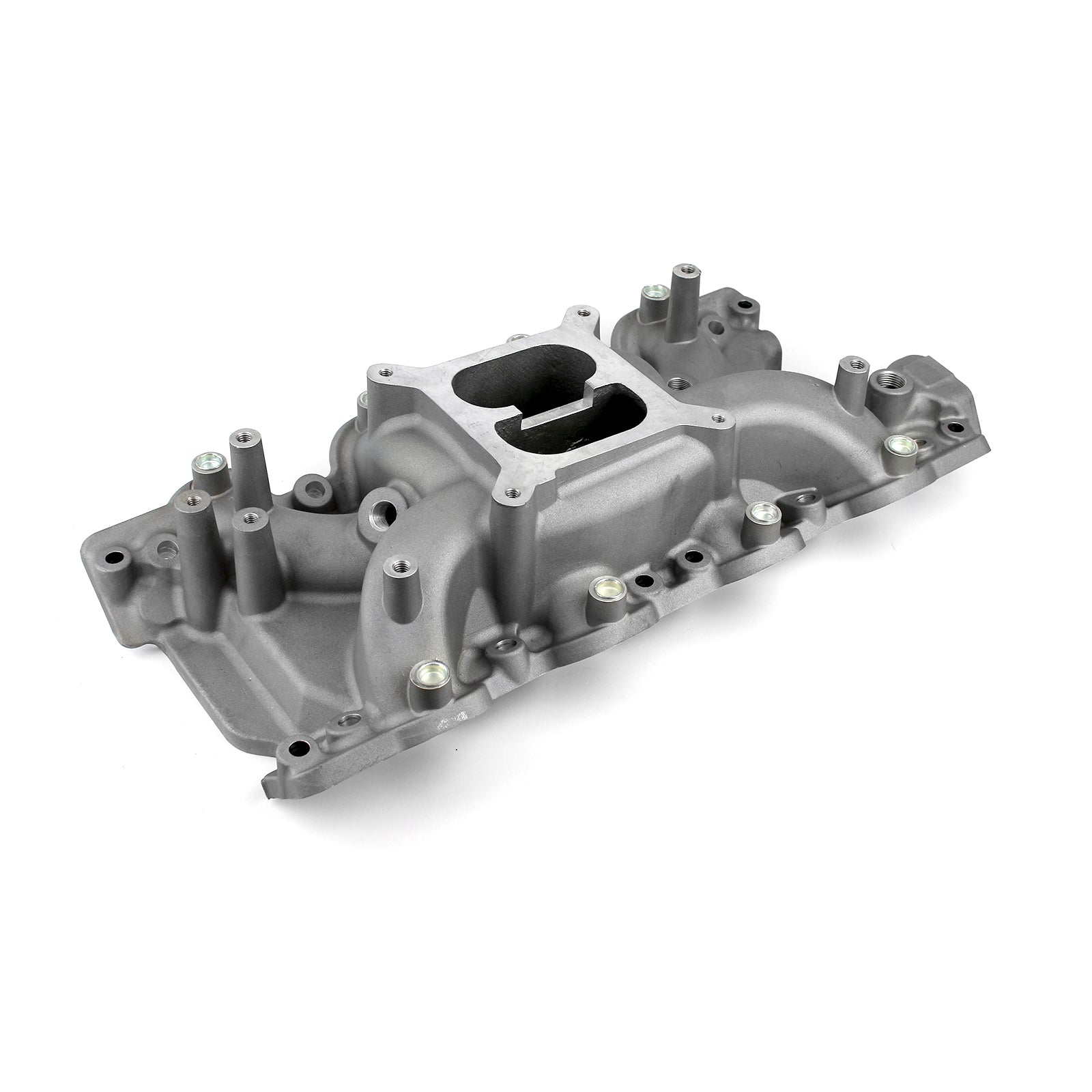 This is our top-of-the-line medium profile Holeshot Plus Series manifold. It is similar to our PCE147.1001 Holeshot, although slightly taller, but with several important modifications. First, it has a square bore carb flange instead of a spread bore. The square bore flange permits direct bolt-on of all popular Holley, Edelbrock, Carter, and Demon carburetors. This manifold is also one of the only aftermarket produced intake for the Boss 351c. This intake will provide better overall water flow and cooler engine operating temperatures. It also features nitrous bosses, and rear water ports that are partly machined for more options. This manifold will typically produce more power than any similar competitive manifold due to larger ports and runners.