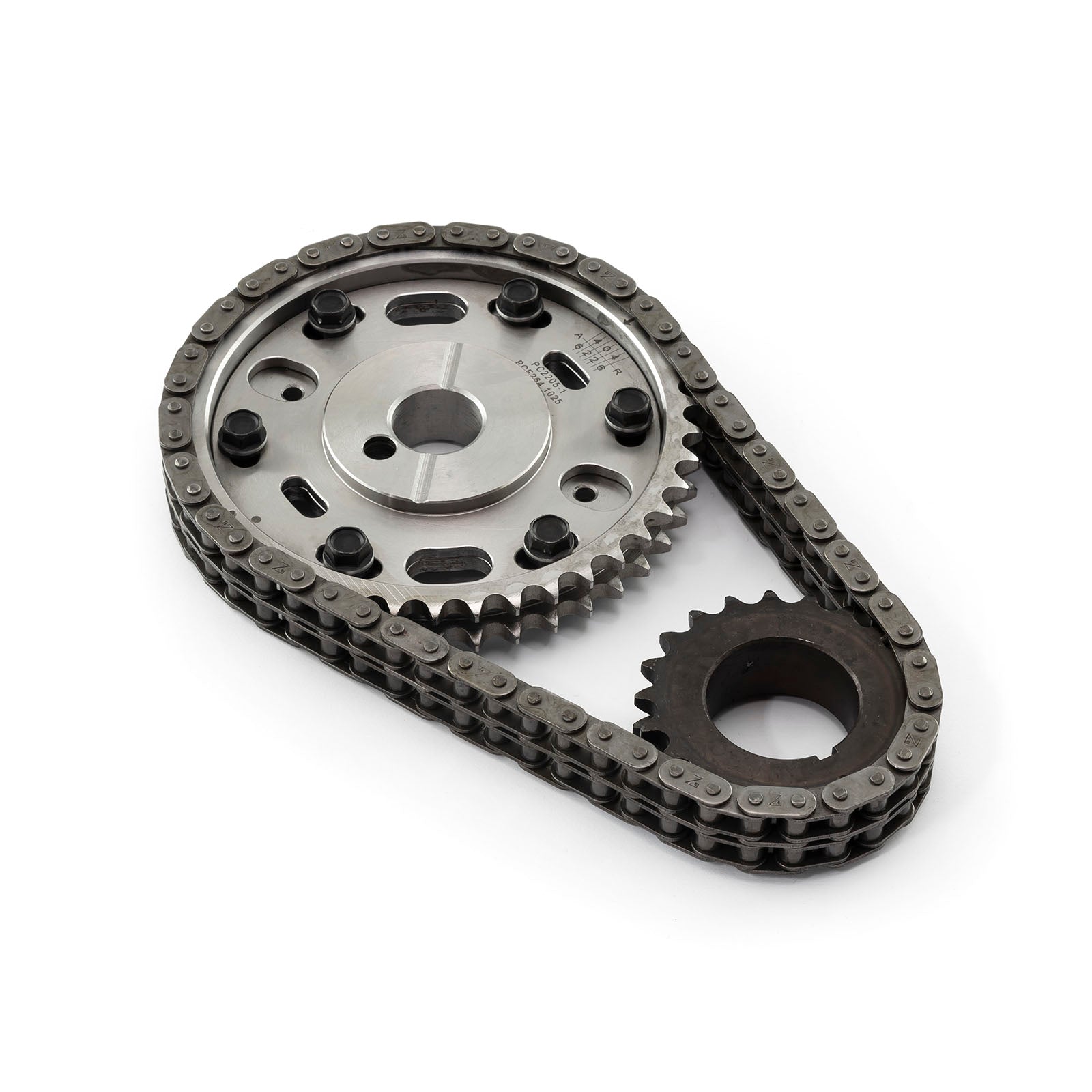 Speedmaster Easy-just Timing Chain Set allows you advance or retard your timing 6" without having to remove your valve covers or having to back off your rocker arms. Exact Radial run out tolerance insures your timing adjustments are accurate. Features a billet cam and crank sprocket. The crank sprocket is also heat treated for additional strength. Heavy-Duty roller chain and one-piece roller thrust bearing assembly insure smooth operation. Features: Adjustable: +6" (advance) or -6" (retard) Aircraft Quality adjusting bolts Premium billet steel cam and crank sprockets Heat-treated crank sprocket One-piece roller thrust bearing assembly Super heavy duty racing double roller chain